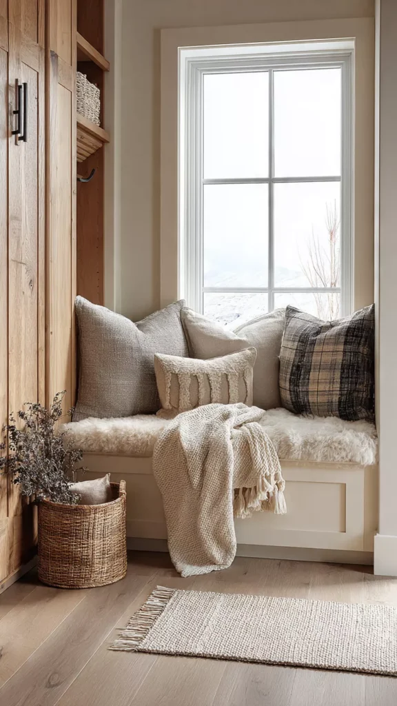A bench in the winter entryway becomes a literal and metaphorical landing place, offering rest from the cold and relief from juggling boots and bags. I love upholstered benches with soft cushions—they instantly warm the space and invite you to slow down. Isn’t it funny how a simple seat can make your whole routine smoother? And when you add a throw blanket or a small pillow, the bench becomes both practical and inviting. It’s one of those pieces that feels like a little luxury every winter morning.