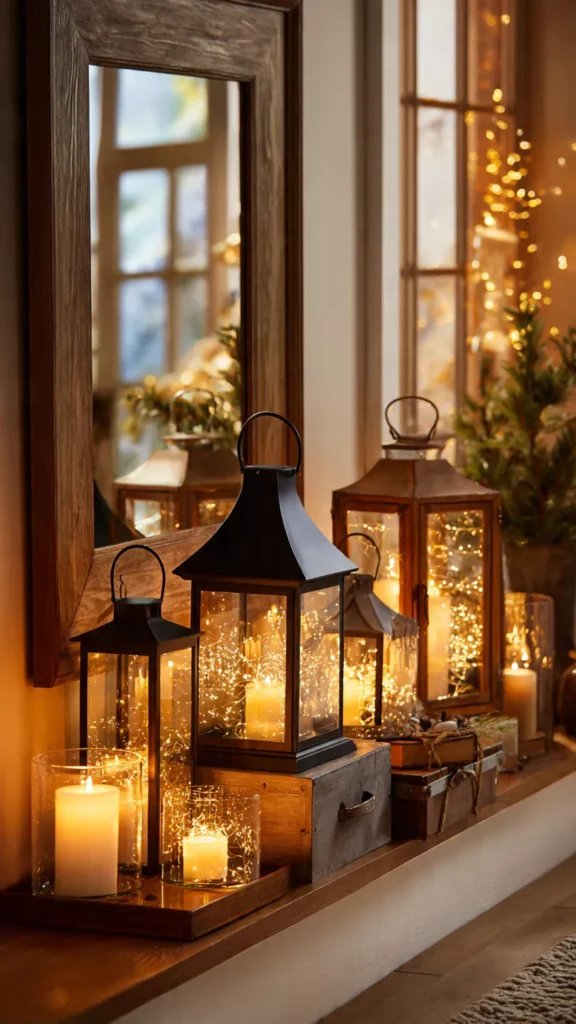 Winter light has a magic of its own, but indoors, it often needs a little help. Lanterns—whether filled with LED candles or twinkling fairy strands—cast the kind of glow that feels like a gentle, familiar hug. I place a couple near my entryway mirror so the light bounces softly around the space, warming even the darkest corners. There’s something nostalgic about lantern light in winter, isn’t there? It feels reminiscent of storybooks and snow-dusted nights. And when you mix different sizes and materials, the entire setup looks intentionally layered and seasonally rich.
