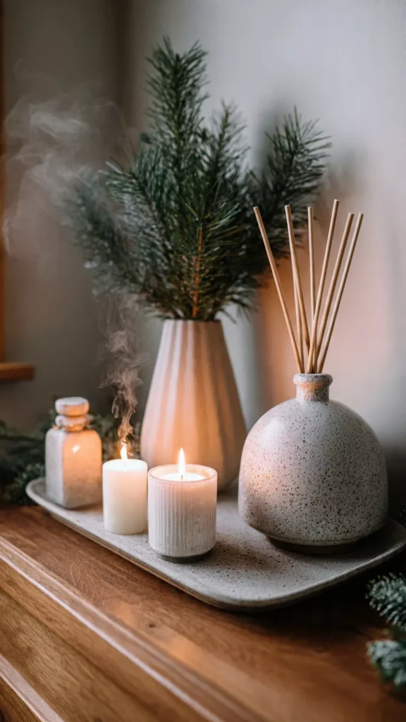 Scent is one of the most powerful mood-setters, and in winter, it becomes almost transformative. I like using diffusers or simmer pots with notes like pine, clove, vanilla, or amber so the entryway smells like warmth before anyone even removes their coat. It’s the kind of detail no one sees but everyone feels. Ever step into a space and instantly feel comforted without knowing why? Winter scents do that. And once your entryway carries its own seasonal fragrance, it quietly elevates the entire home.