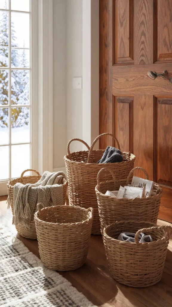 Winter clutter is real, and let’s be honest—sometimes it feels like scarves and hats multiply on their own. That’s why I rely heavily on deep woven baskets by the door to corral the chaos. The warmth of the natural fibers instantly softens the entryway, and when everything has a place, the whole area suddenly appears intentionally styled rather than wildly lived-in. I love how baskets can hold anything: gloves, dog leashes, winter mail, you name it. Isn’t it amazing how something so simple can genuinely shift the energy of a room? When guests arrive, there’s no guessing where things go, and the entryway starts to function beautifully.
