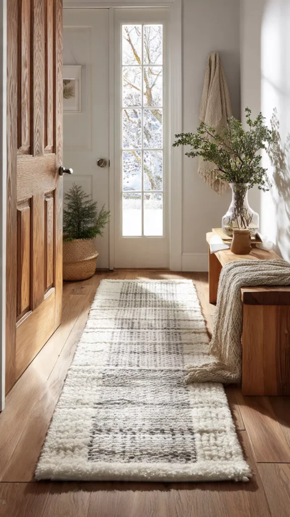 A winter entryway without a cozy rug feels like a story missing its opening line, and I’ve learned that a thick, textured runner immediately shifts the mood. Whether you choose faux fur, wool, or a heavy braided weave, the moment your feet sink into something soft, winter feels gentler. I like layering a decorative rug over a durable mat to keep things practical without sacrificing charm. Don’t you think rugs have this underrated ability to make a space feel instantly lived-in? And when you choose a seasonal pattern—like a subtle plaid or a muted Nordic design—the whole area comes alive with quiet winter character.