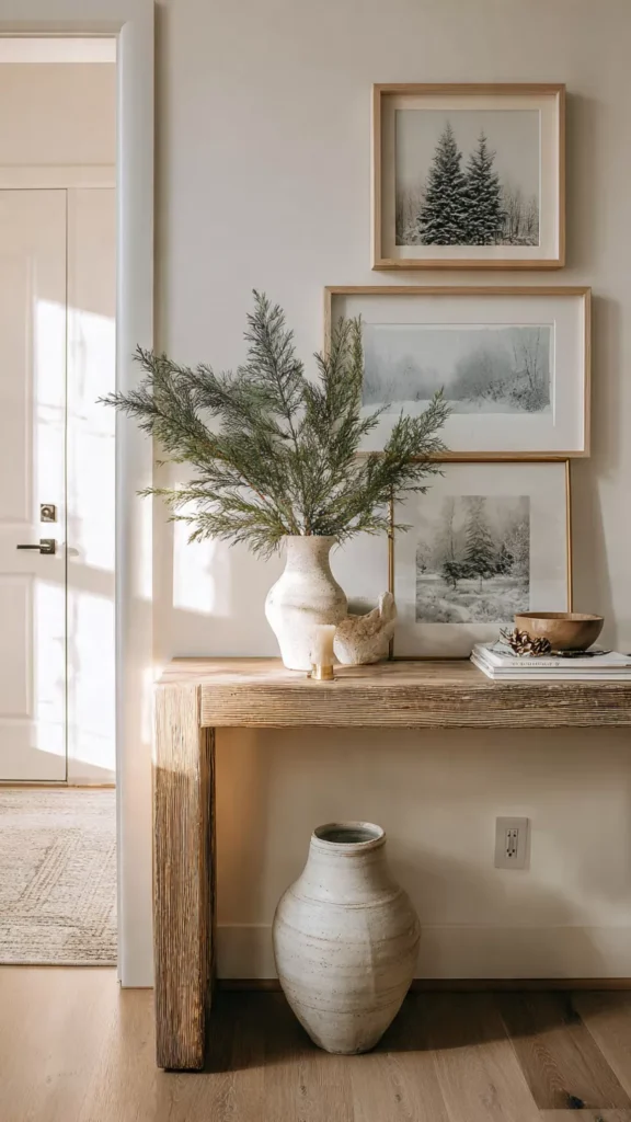 A console table becomes the heart of a winter entryway when you style it thoughtfully, and I always think of it as the space where personality shines. A ceramic bowl catching keys, evergreen sprigs tucked in a vase, and a few winter prints framed casually make a beautiful tableau. When I first tried this, I was amazed at how a few curated objects could create such a mood. Do you ever notice how a single vignette can shift your entire perception of a room? Winter décor doesn’t have to be loud—sometimes it’s the soft touches that create the deepest feeling of home.