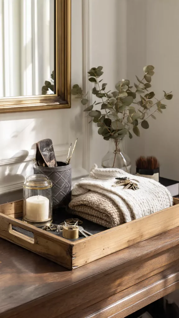 Trays are small but mighty, especially in the winter entryway where small items multiply like wild. I use wooden or metal trays to hold keys, pocket warmers, tiny winter accessories, and even seasonal décor accents. It’s wild how one tray can prevent full-blown chaos. Ever notice how a designated spot suddenly makes you more organized without even trying? Seasonal trays with winter motifs or natural textures add style while keeping the area tidy.