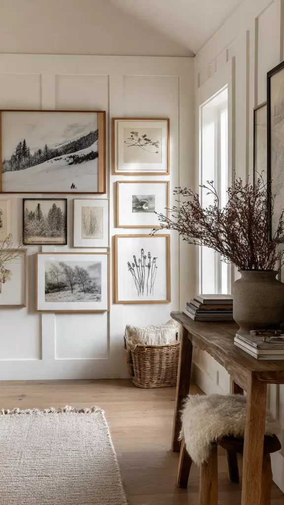 Art has this quiet power, and swapping out your usual pieces for winter-themed ones can completely transform the energy of the entryway. Think vintage ski posters, snowy landscapes, or minimalist winter botanicals that whisper the season’s calm. I love the ritual of changing artwork with the seasons—it feels like a fresh chapter every time. Isn’t it wild how one framed print can change the entire vibe of a wall? Even a collection of small pieces can tell a story that sets the emotional tone the moment you step in from the cold.