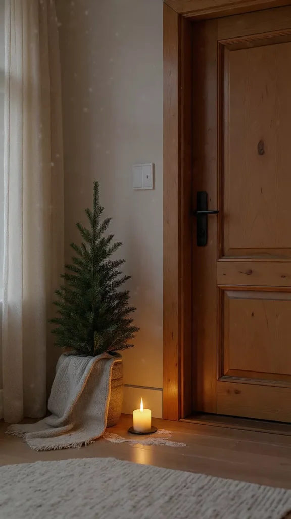 One of my favorite winter entryway traditions is placing a small potted evergreen near the door. There’s something grounding about having a bit of nature greeting you after stepping in from brisk air. The soft scent of pine feels like a breath of calm and instantly shifts the atmosphere. Even a tiny tabletop tree can create a moment of winter magic. Don’t you love when décor makes you slow down for a second? That’s what this does—quietly, beautifully, without needing attention.