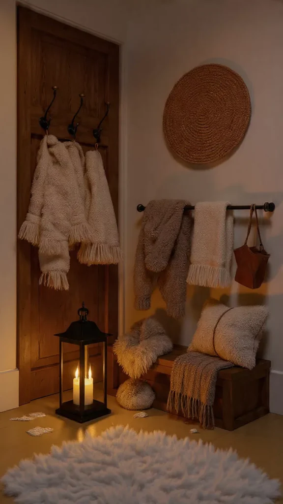 Winter is all about sensory comfort, and adding textures—like faux fur accents, wool throws, knit pillows, or even a chunky wall hanging—creates instant warmth. I love how these textures contrast with the cold air outside; stepping through the entryway becomes a little moment of relief. Texture just hits different in winter, doesn’t it? It makes even the smallest space feel like a retreat. And when everything is soft, layered, and touchable, the whole entryway seems to say slow down, you’re home now.