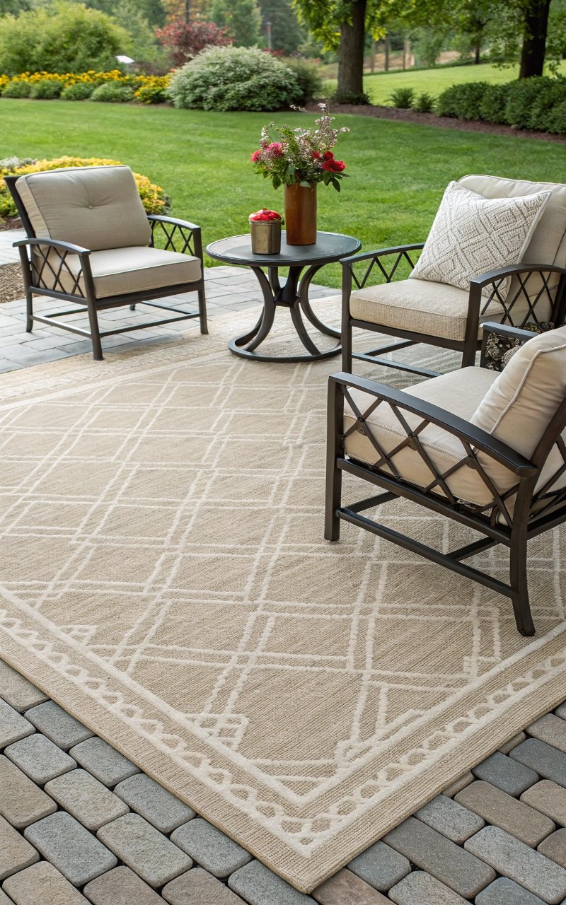 Outdoor rugs define the space beautifully. I love how they anchor furniture. The backyard feels like an outdoor room. Nothing feels scattered. Doesn’t structure improve design? It does.