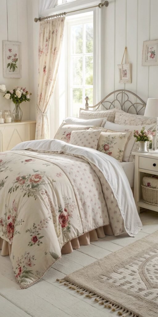 Floral bedding instantly defines the room’s mood. I love how delicate patterns soften the entire space effortlessly. The bed feels inviting and cozy. Nothing feels visually harsh. Doesn’t bedding shape the emotional tone of a bedroom? Florals create warmth beautifully.