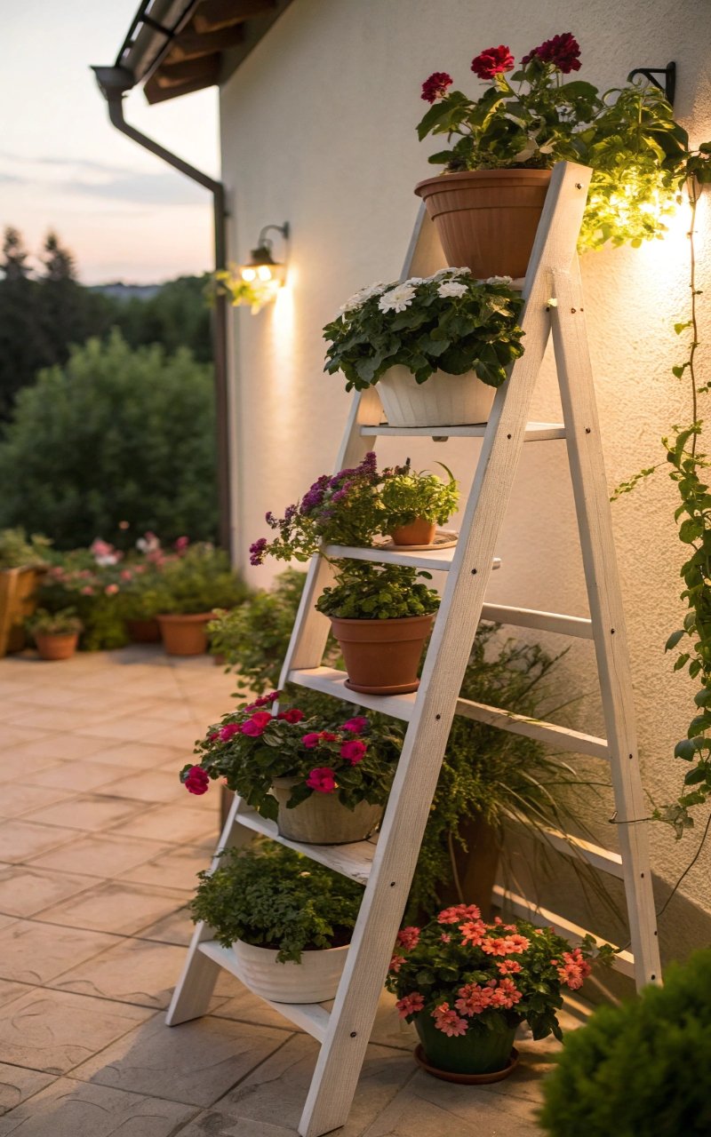 Using a ladder to display pots added height and personality instantly. The tiered setup and varied greenery create a layered, eye-catching feature. I love how it turns a simple object into something decorative. It feels creative and practical. Have you ever used everyday items in unexpected ways? This one works beautifully.