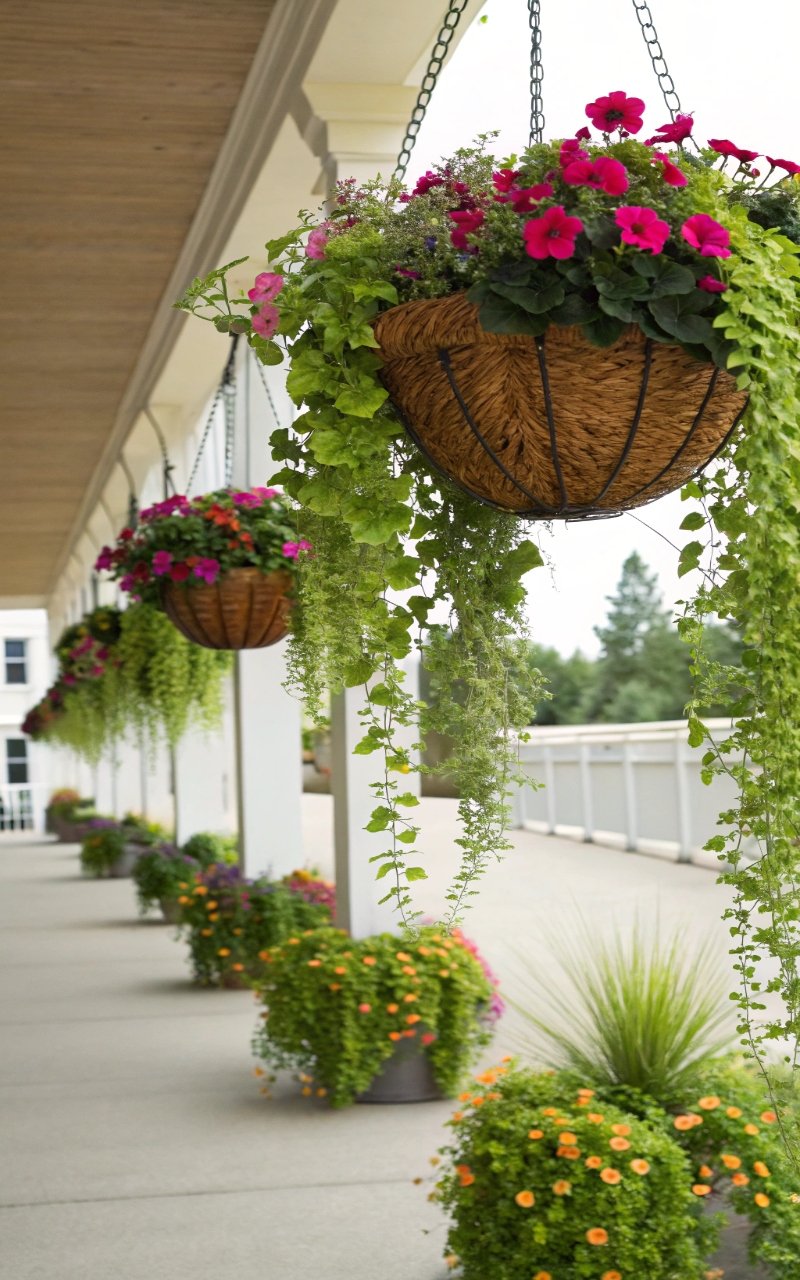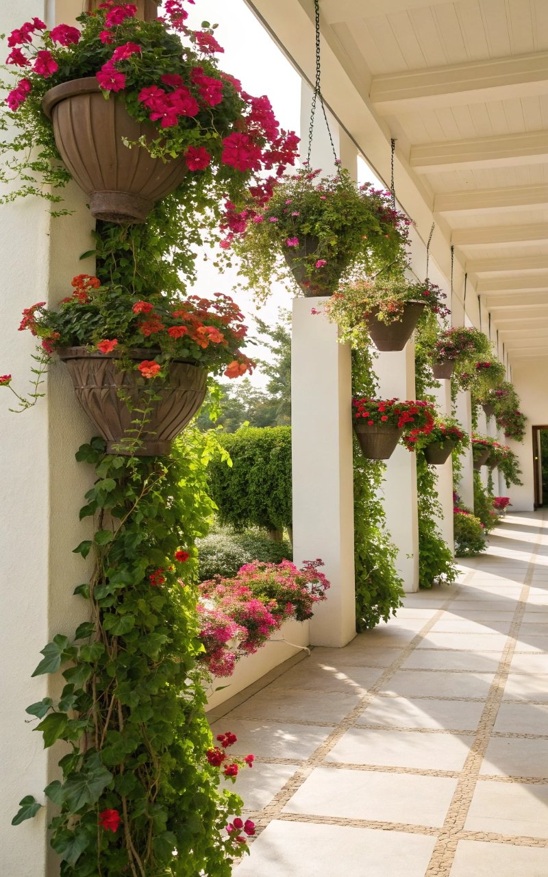 Hanging pots filled with flowers and trailing vines added softness and movement. The flowing greenery and colorful blooms create a light, airy effect that feels lively. I love how it brings life to vertical space. It’s perfect for smaller areas too. Have you ever noticed how movement changes a space? This one adds that gentle touch.