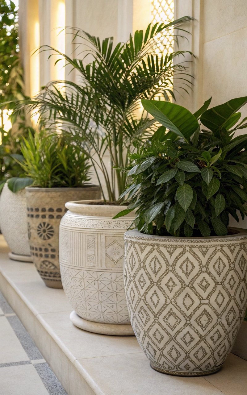 Using patterned pots with mostly green plants created a subtle but stylish look. The textured designs and rich greenery balance each other perfectly. I love how it adds detail without overwhelming the space. It feels curated and intentional. Have you ever noticed how patterns can elevate simple setups? This one does just that.