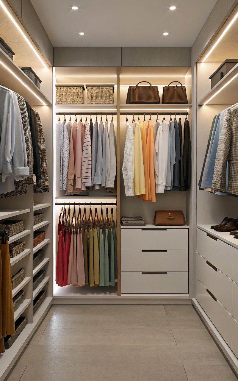 Organizing clothes by color gave my closet a clean, visually pleasing look. The coordinated palette and structured arrangement make everything easier to find. I love how it feels calm and organized. It’s simple but effective. Doesn’t color organization just feel satisfying? This one creates that effect.