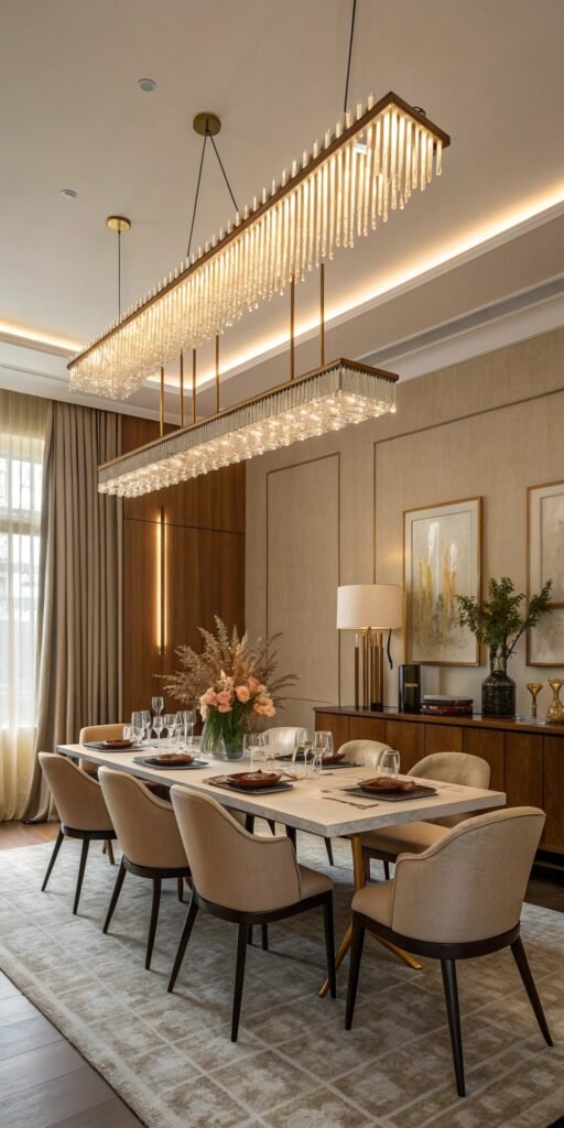 Linear chandeliers feel modern yet vintage. I love how their elongated shape defines dining areas. The room feels structured. Lighting feels intentional. Doesn’t clean geometry feel timeless? Linear designs add elegance effortlessly.