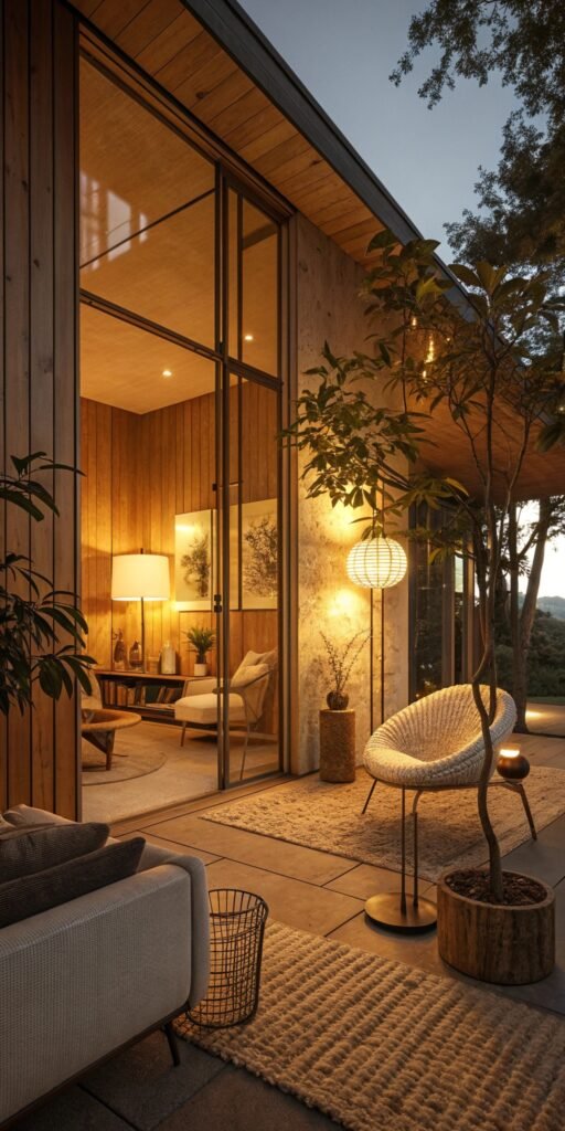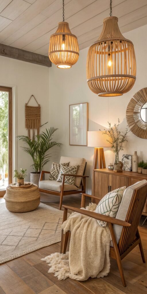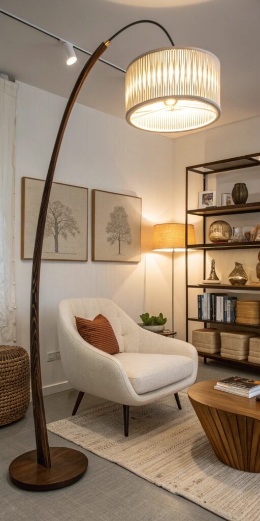 Wood lighting adds natural warmth. I love how organic textures soften modern lines. The room feels balanced and inviting. Nothing feels cold. Doesn’t wood ground mid century design beautifully? It creates effortless harmony.