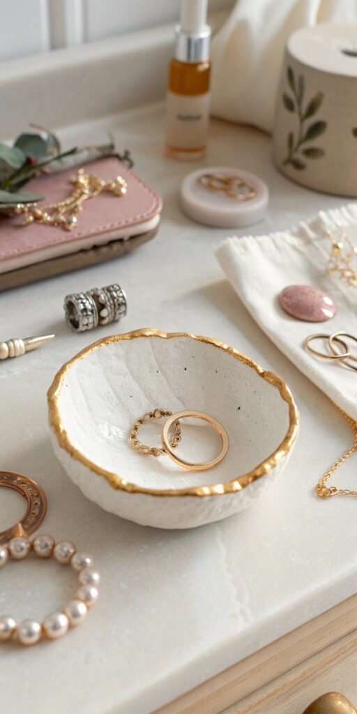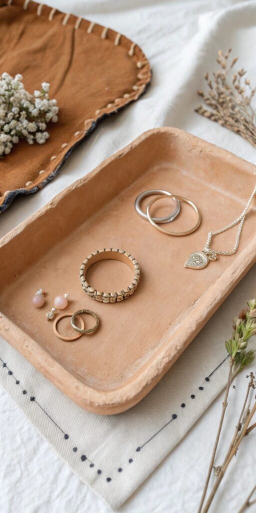 Trinket bowls are endlessly useful. I love shaping tiny curved bowls for coins or jewelry. They feel modern and minimal. Nothing feels excessive. Don’t practical crafts feel more satisfying? They’re cute and functional.