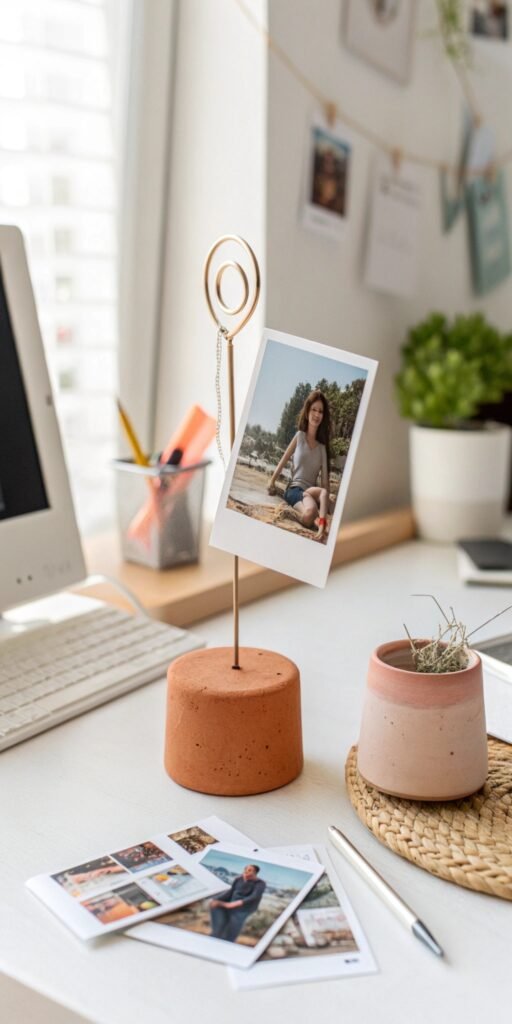 Photo holders are easy and thoughtful. I love shaping small bases and inserting a wire loop. The piece feels simple but impactful. Nothing feels cluttered. Isn’t displaying memories always sweet? They look great on desks.