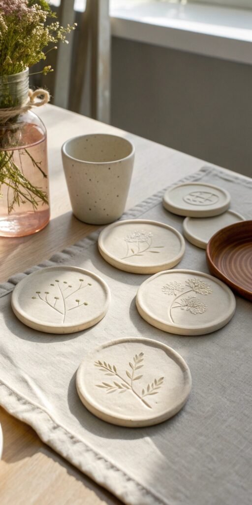 Tiny coasters make cute accent pieces. I love stamping subtle patterns into flat clay circles. The result feels textured and artistic. Nothing feels overdone. Don’t small details elevate simple shapes? They’re easy but look impressive.