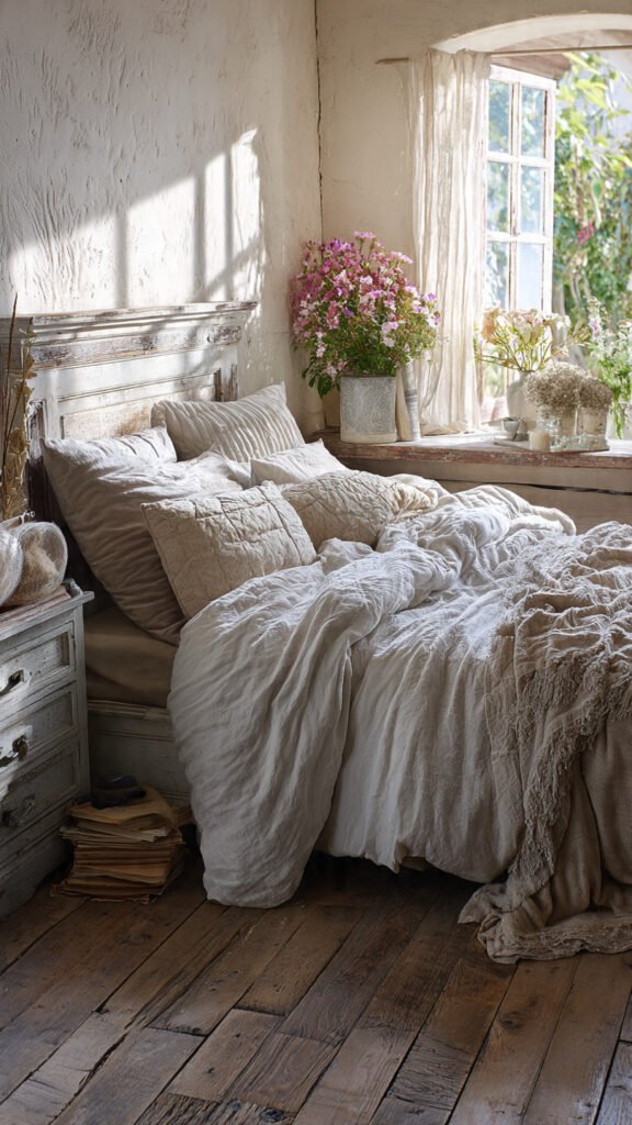A bed with curved lines or aged details adds instant character. I love metal or carved wood frames with a slightly worn finish. The bed becomes the heart of the room. Romance feels effortless. Doesn’t a beautiful frame change the entire mood? It anchors shabby chic style perfectly.