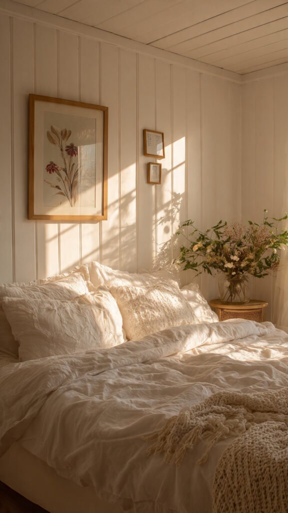 Soft neutral walls set the tone immediately. I love warm whites, creams, or the palest blush. The bedroom feels light and restful. Everything else settles naturally into the space. Doesn’t a quiet wall color make it easier to relax? It’s the foundation of cozy vintage style.