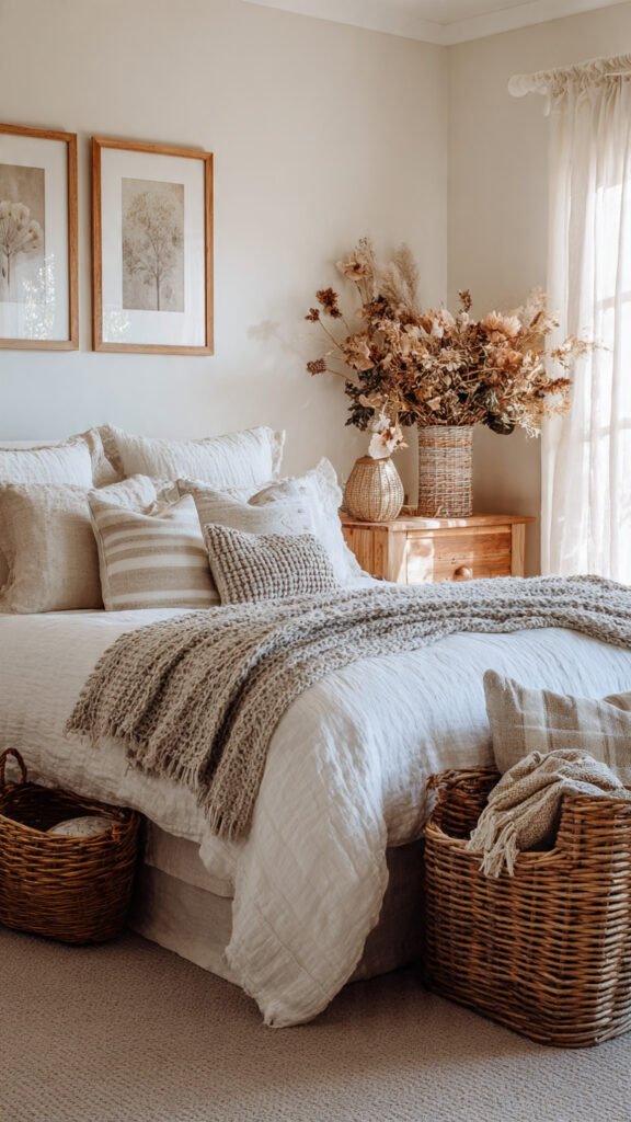 Natural touches calm a bedroom instantly. I love woven baskets, dried florals, or wood trays. The room feels balanced and warm. Nature softens everything. Doesn’t organic texture help you unwind? It brings gentle grounding.