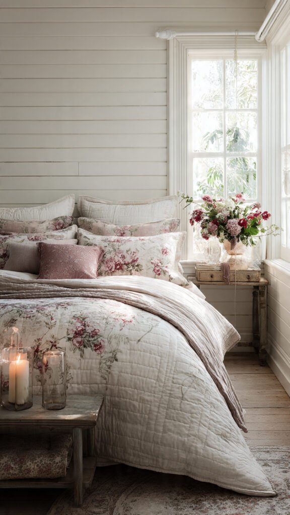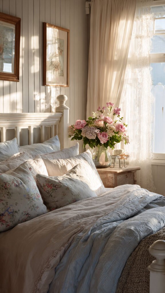 Pastels add gentle color. I love blush, faded blue, or soft lavender accents. The bedroom feels romantic and calm. Balance remains intact. Doesn’t soft color feel more timeless than bold hues? It enhances shabby chic style beautifully.