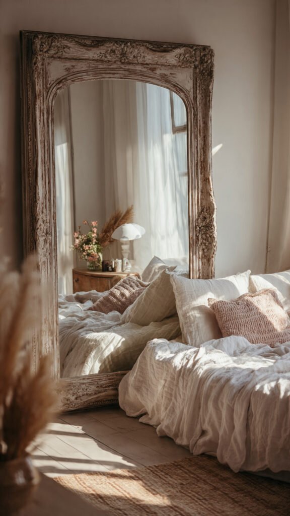 Vintage mirrors add softness and reflection. I love ornate or distressed frames. The bedroom feels brighter and more open. Light bounces gently. Doesn’t a mirror double the charm of a room? It’s both practical and decorative.