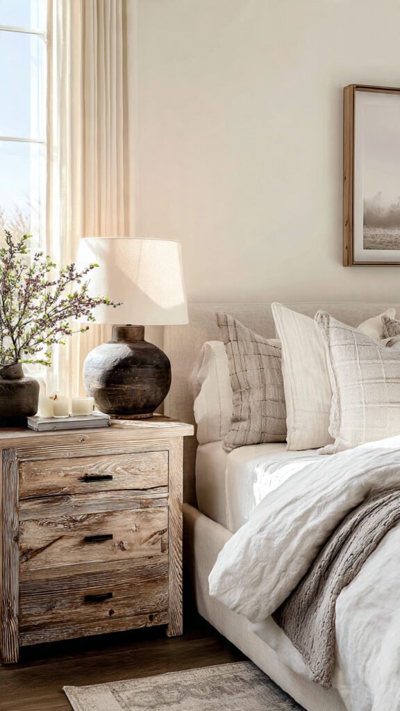 Nightstands with worn finishes feel timeless. I love visible grain and chipped paint details. The bedroom feels grounded and lived-in. Nothing feels too new. Doesn’t aged wood add emotional warmth? It brings quiet charm.