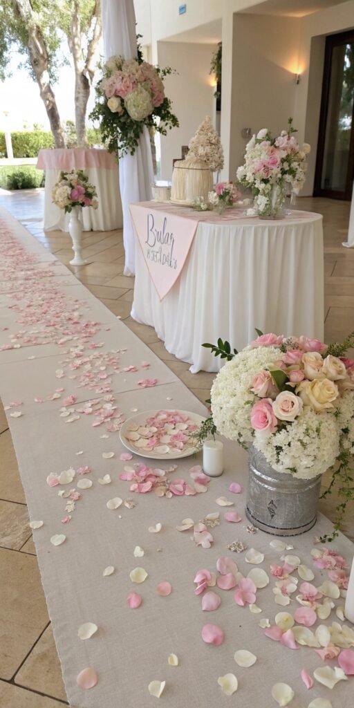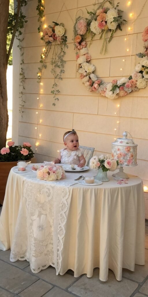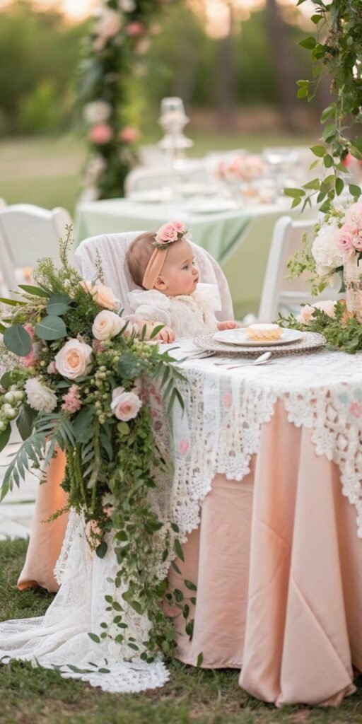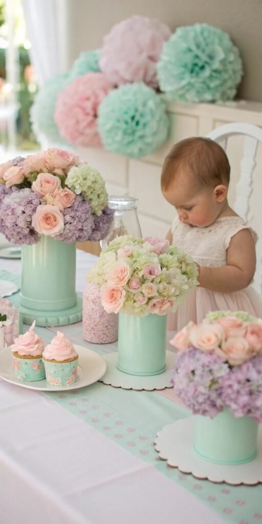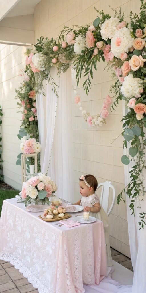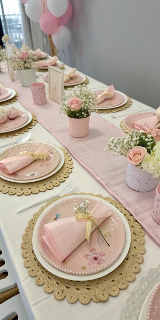 Floral confetti adds playful charm. I love scattering petals gently across the table. The setup feels whimsical and celebratory. Texture feels light. Doesn’t softness belong in Baby in Bloom decor? It adds effortless romance.