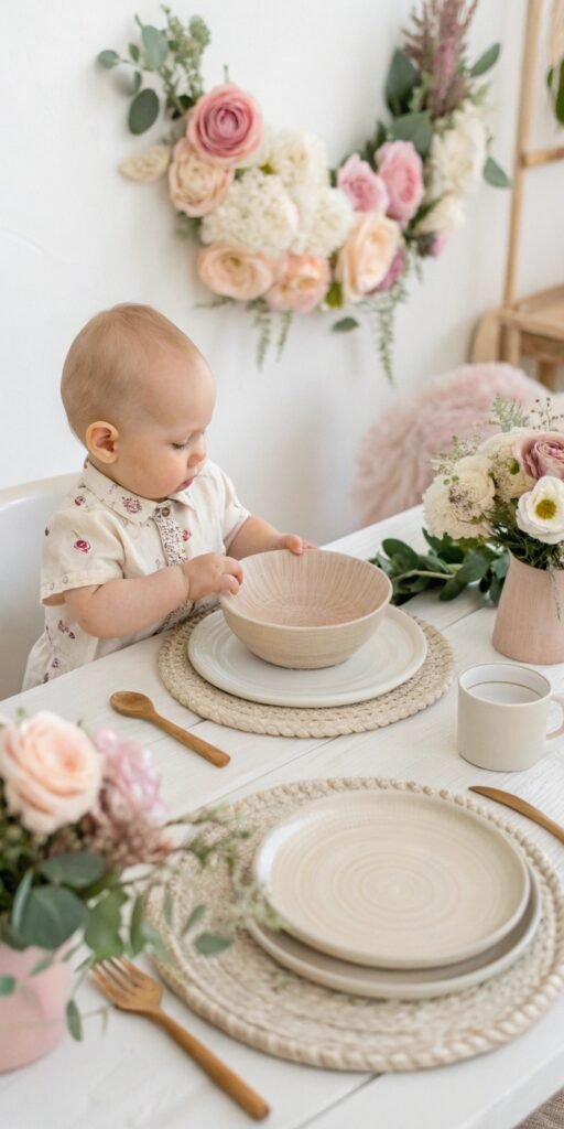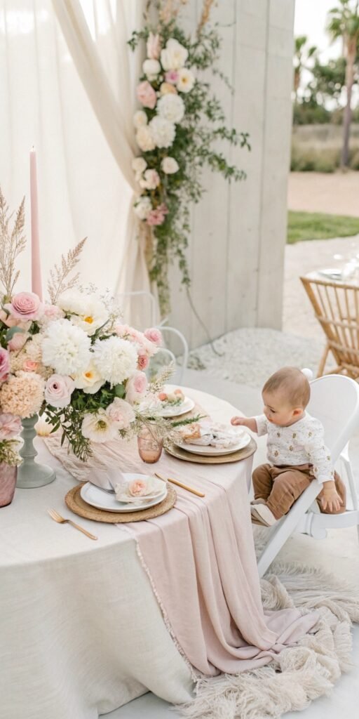 Pink and cream tones feel timelessly romantic. I love how the palette creates warmth without heaviness. The table feels dreamy and elegant. Nothing feels loud. Doesn’t softness define Baby in Bloom styling? It always works beautifully.