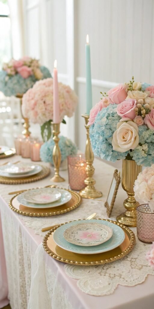 Soft gold accents add gentle luxury. I love brushed or muted finishes. The table feels refined yet warm. Shine feels delicate. Doesn’t warmth and metallic glow pair beautifully? Gold enhances romance effortlessly.