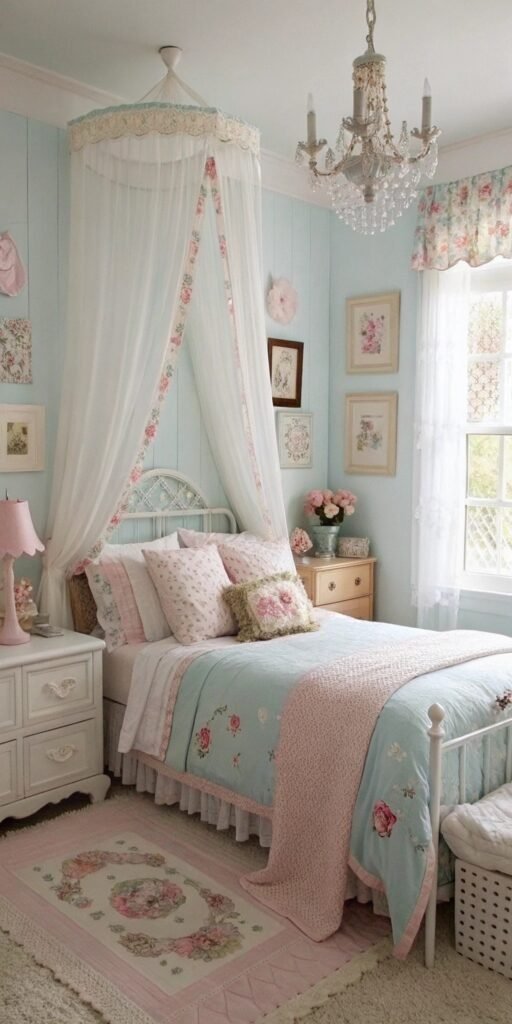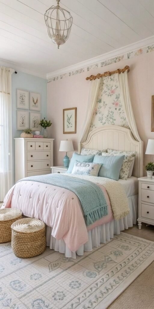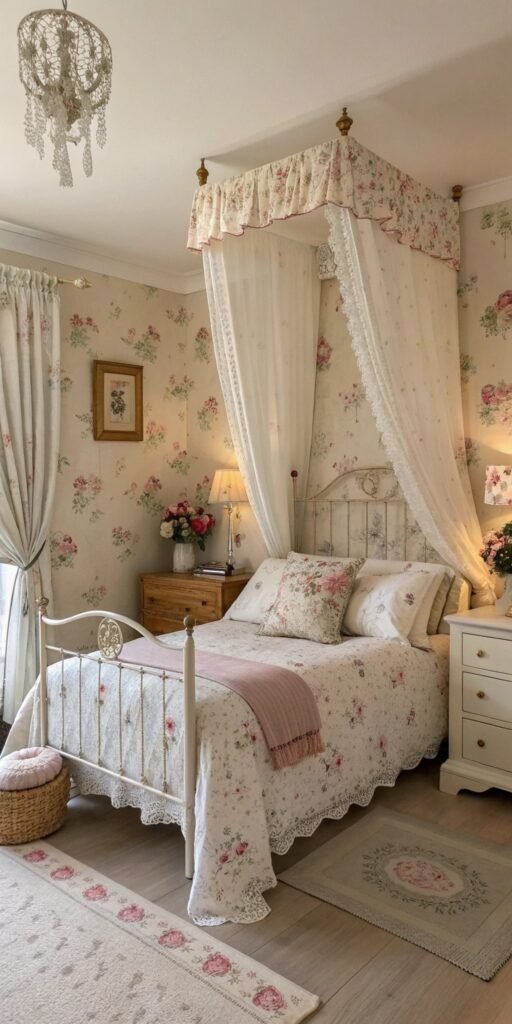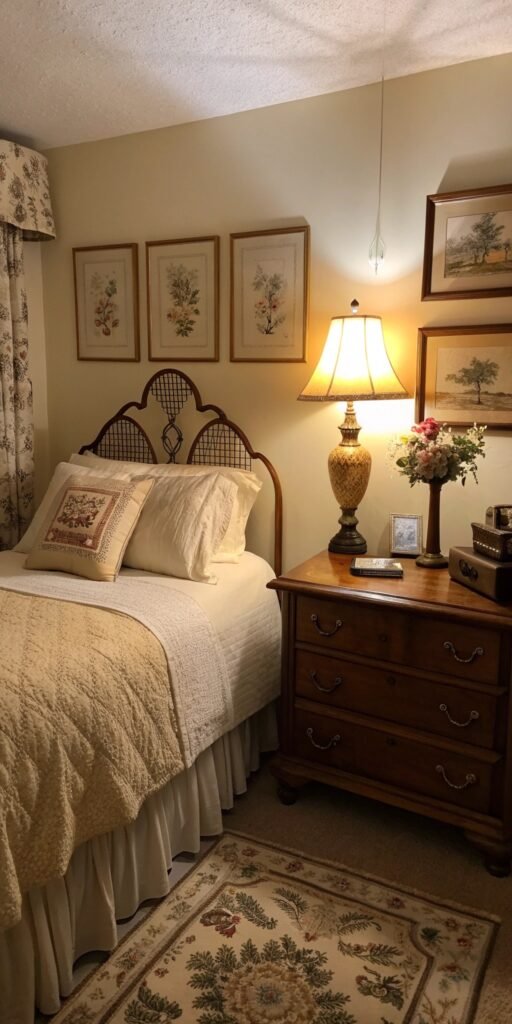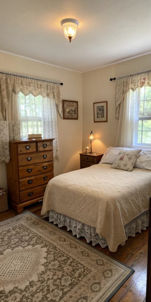 Layered bedding transforms a small bedroom instantly. I love soft quilts, textured throws, and delicate pillows. The bed feels inviting and warm. Nothing feels flat. Doesn’t layering always enhance comfort? Vintage styling thrives on softness.
