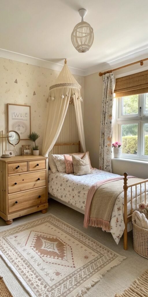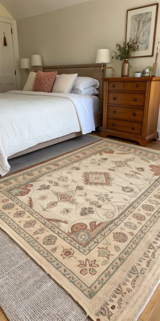 Rugs anchor small bedrooms beautifully. I love muted patterns that add warmth underfoot. The room feels layered and cohesive. Nothing feels stark. Doesn’t softness belong everywhere? Vintage rugs enhance comfort instantly.