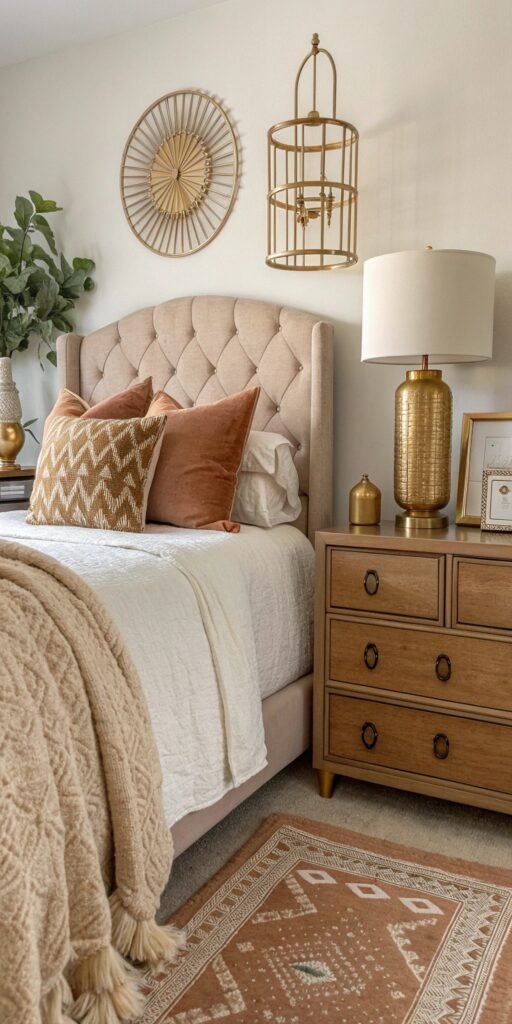 Warm metals elevate vintage bedrooms subtly. I love brushed brass or antique finishes. The room feels richer and more layered. Nothing feels flashy. Doesn’t warmth enhance elegance? Metallic accents add quiet refinement.
