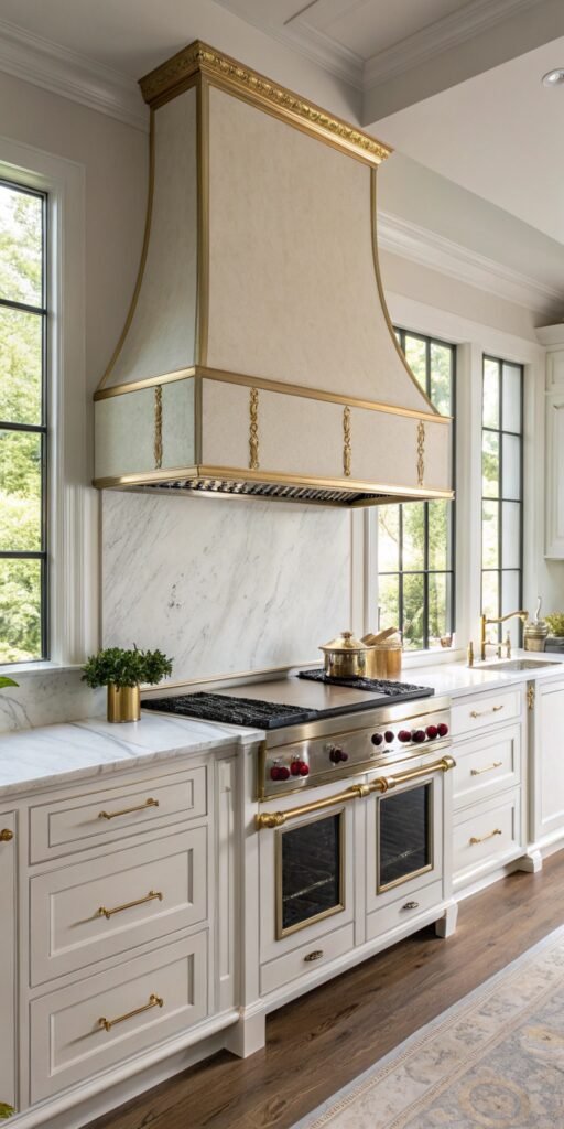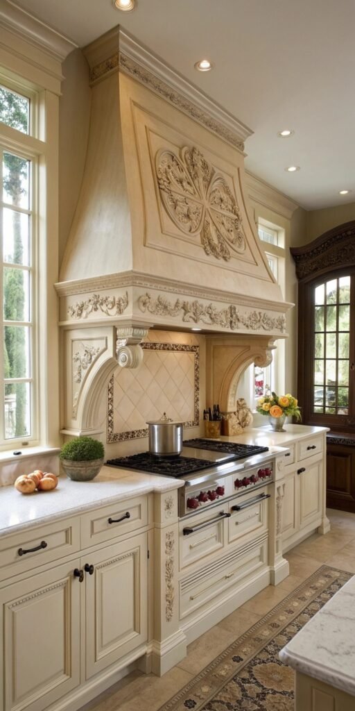 Vintage details create nostalgic charm. I love carved trim or subtle moldings. The hood feels handcrafted and warm. Nothing feels mass-produced. Doesn’t history add character? It’s perfect for traditional kitchens.