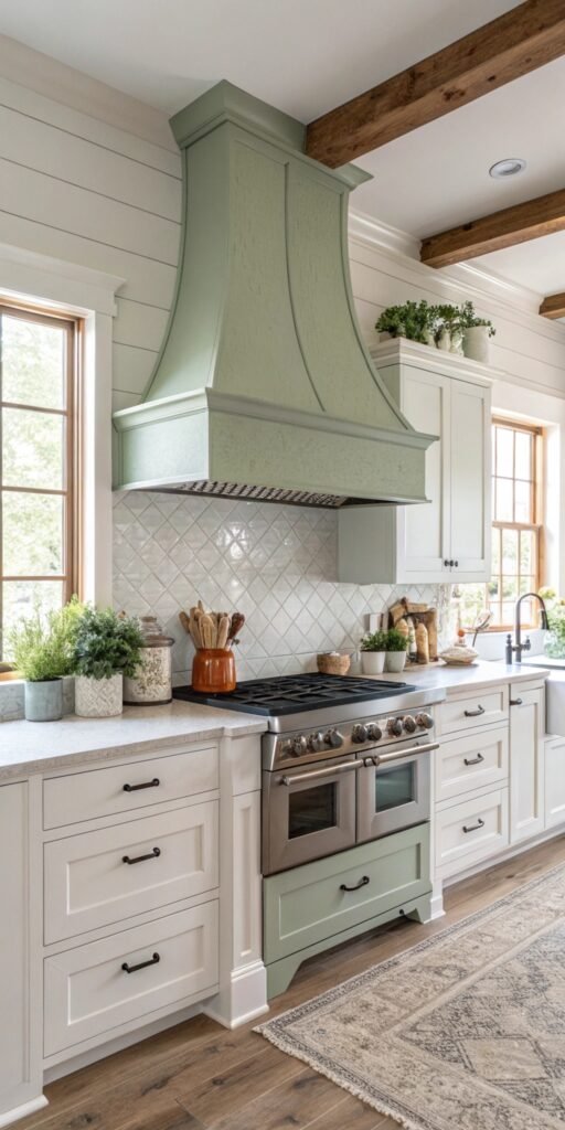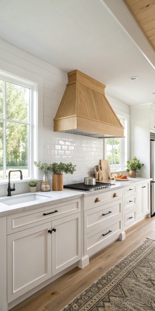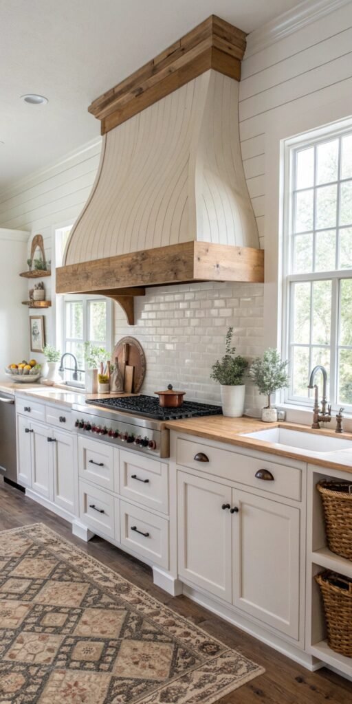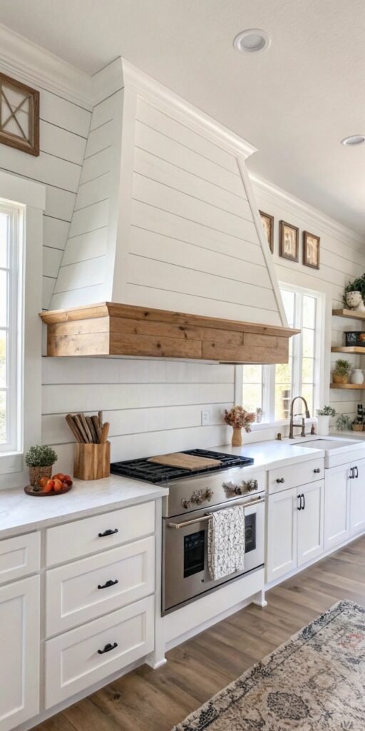 Shiplap instantly adds farmhouse charm. I love how horizontal boards create texture and visual depth. The hood feels integrated into the kitchen design. Nothing feels bulky or plain anymore. Doesn’t subtle texture make everything more interesting? It’s a timeless choice.