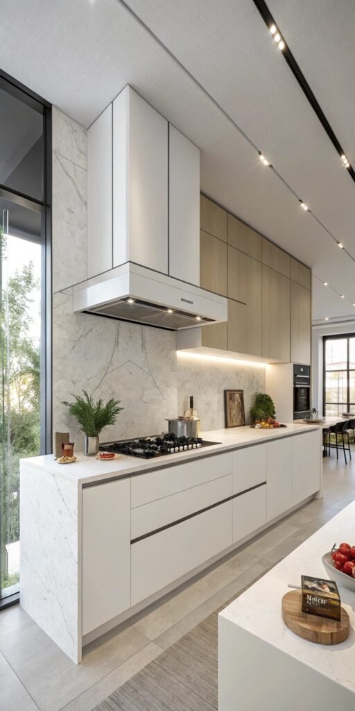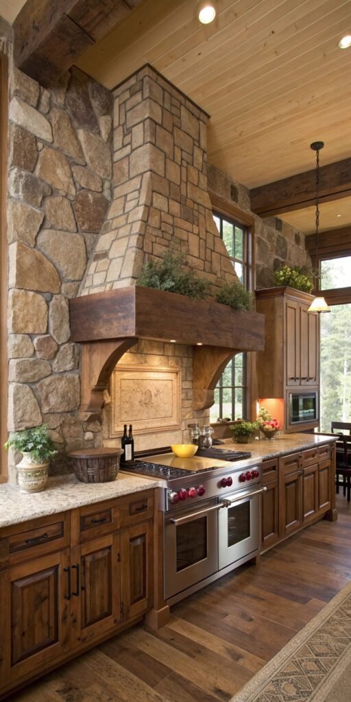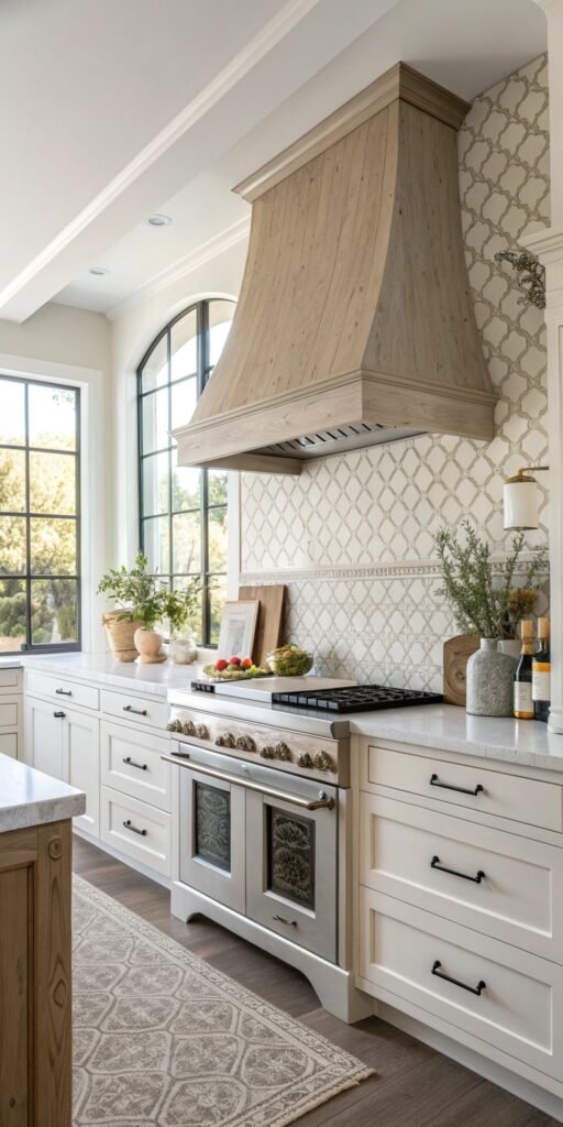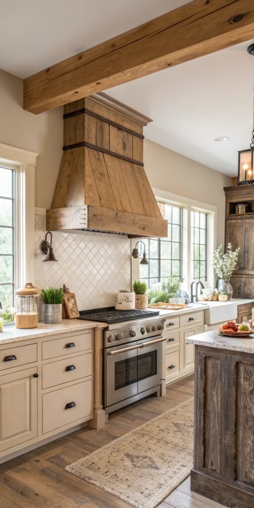 Wood beams add warmth and character instantly. I love how natural wood tones soften modern kitchens. The hood becomes a striking centerpiece. Nothing feels sterile or cold. Doesn’t natural texture elevate the room? It’s cozy and dramatic.