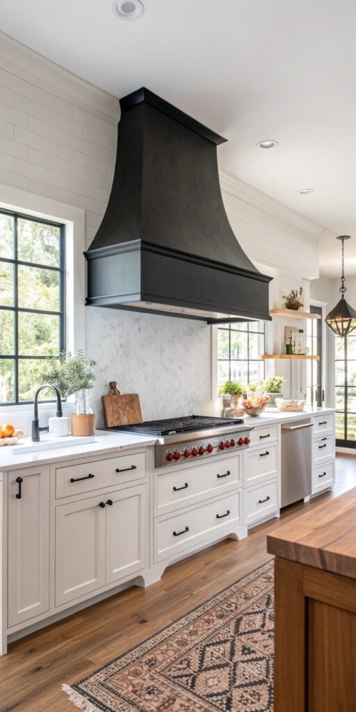 A black hood instantly anchors a kitchen. I love the dramatic contrast against lighter cabinetry. The design feels modern and confident. Nothing feels timid. Doesn’t boldness create impact? It’s a striking focal point.