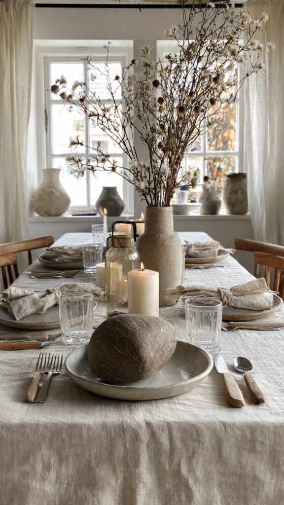 A linen tablecloth sets a cozy foundation. I love pairing it with a simple wooden centerpiece. The table feels calm and inviting. Meals feel special. Doesn’t simplicity make gatherings feel more relaxed? This setup always works.