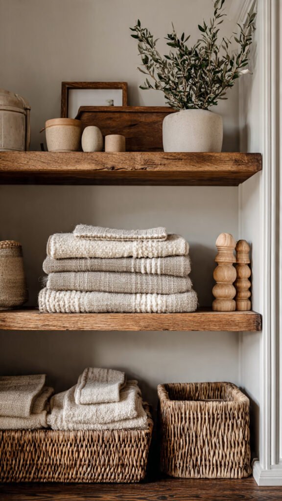 Shelves feel cozier with linen layers. I love placing folded linen cloths under wooden decor pieces. The look feels lived-in. Nothing feels staged. Doesn’t layering make shelves feel warmer? Linen adds softness instantly.