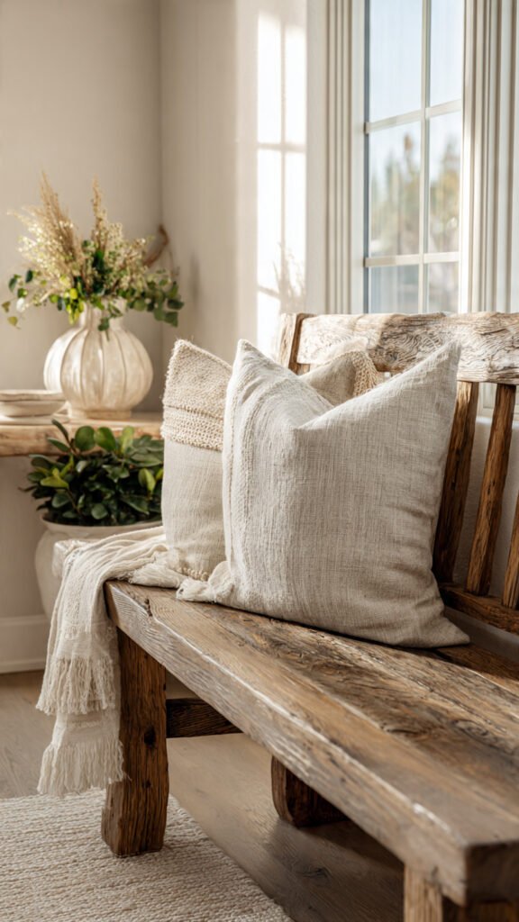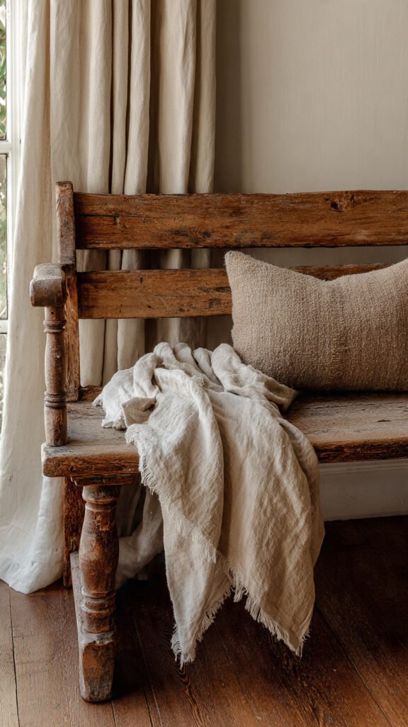 A linen throw draped over a wooden bench adds instant coziness. I love how it invites touch. The space feels welcoming. Comfort becomes visible. Doesn’t fabric signal rest? Linen does this subtly.