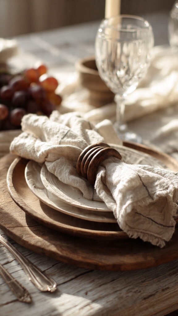 Linen napkins feel elevated without being formal. I love pairing them with wooden rings for a farmhouse touch. The table feels thoughtful and warm. Nothing feels stiff. Doesn’t texture matter more than color here? This pairing always works.