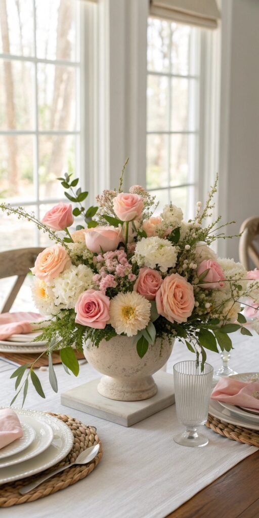 Handmade centerpieces add warmth effortlessly. I love mixing faux blooms with simple vases or jars. The table feels fresh yet relaxed. Nothing feels overly formal. Doesn’t DIY styling feel more inviting? Floral softness enhances Easter charm instantly.
