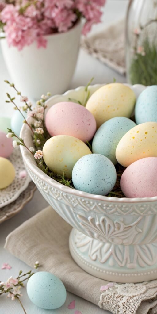 Painted eggs add delicate seasonal charm. I love soft pastel or neutral designs arranged in bowls or trays. The decor feels subtle yet festive. Nothing feels excessive. Doesn’t DIY creativity feel more meaningful? Eggs define Easter styling beautifully.
