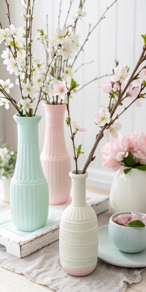 Pastel vases brighten spaces gently. I love painting simple jars or thrifted pieces. The decor feels fresh yet subtle. Nothing feels overpowering. Doesn’t soft color enhance spring styling? DIY vases add charm effortlessly.