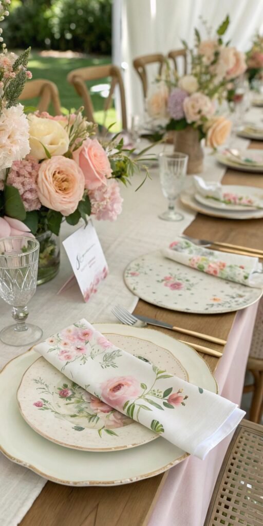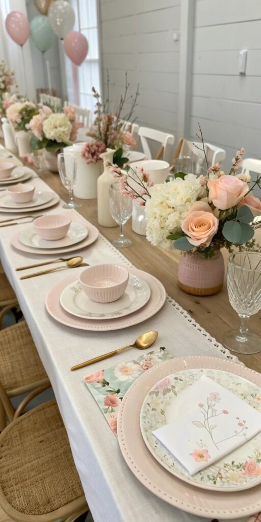 Pastels define elegant Baby in Bloom styling. I love blush, cream, soft peach, and pale lavender combinations. The table feels dreamy yet refined. Nothing feels overpowering. Doesn’t gentle color feel timelessly beautiful? Soft palettes create calm elegance.