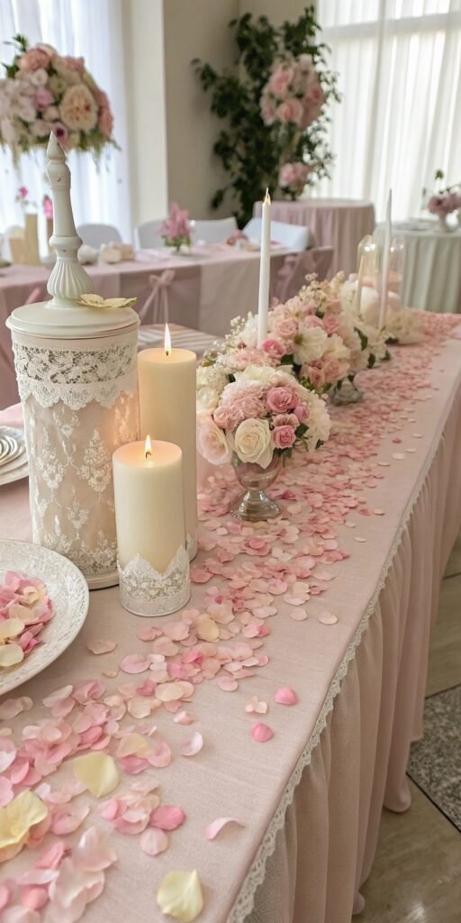 Floral confetti adds subtle whimsy. I love scattering petals lightly across the table. The setup feels romantic and celebratory. Texture feels soft. Doesn’t delicate drama enhance elegance? Petals add charm effortlessly.