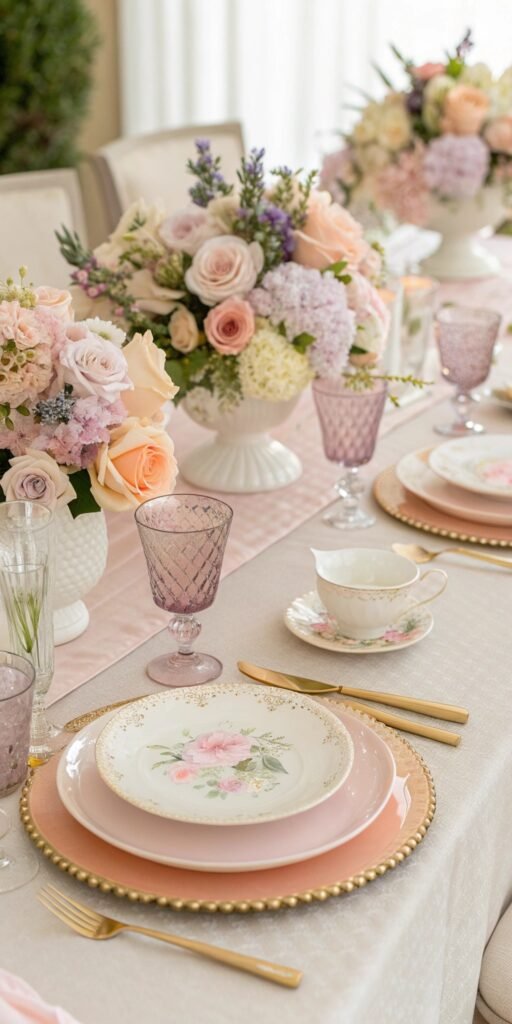 Soft gold accents add subtle luxury. I love brushed or muted finishes that glow gently. The table feels elevated and refined. Shine feels delicate. Doesn’t warmth pair beautifully with metallic softness? Gold enhances romance effortlessly.