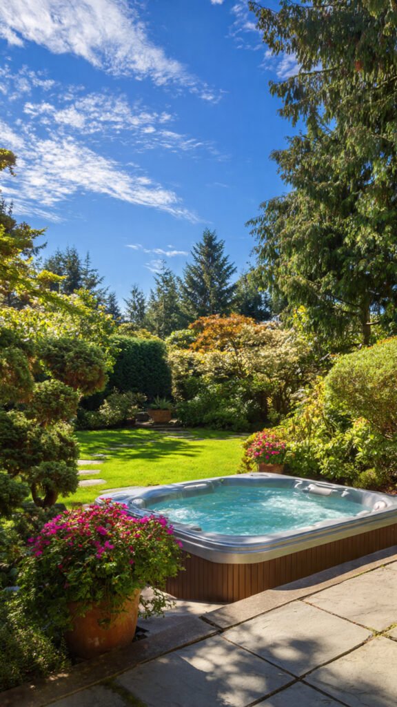 Surrounding a jacuzzi with plants creates a tranquil retreat. I love how greenery softens hard edges and adds life. The space feels fresh and calming. Nature enhances relaxation. Doesn’t green make luxury feel more organic? It’s a perfect pairing.