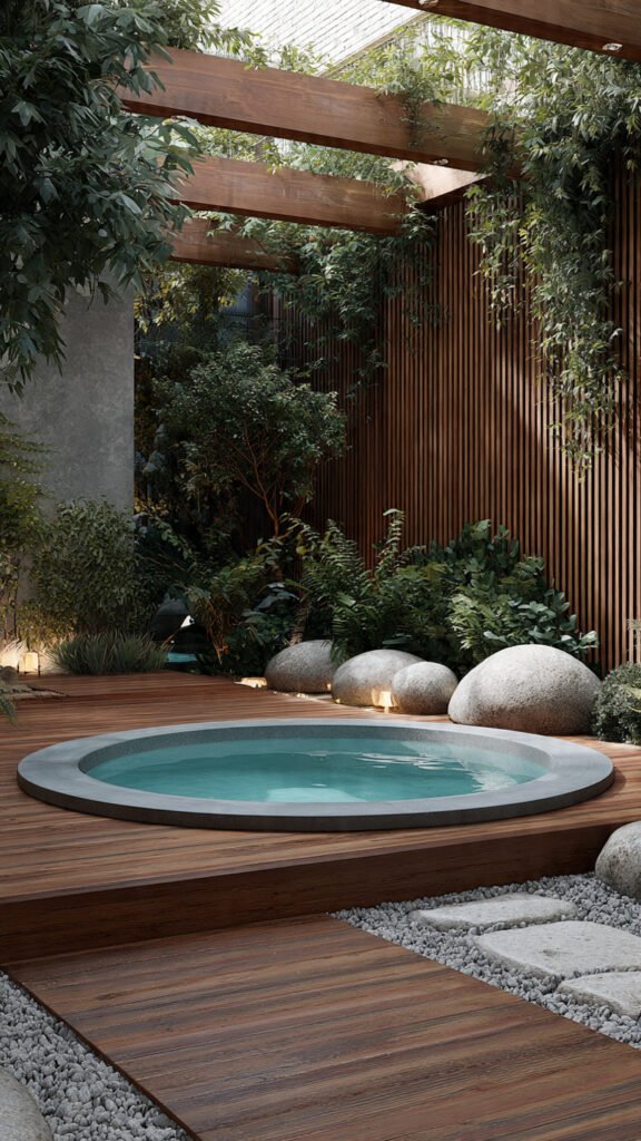 Surrounding a jacuzzi with wood adds warmth and richness. I love how natural textures balance the sleek water feature. The space feels inviting and calm. It softens the overall design. Doesn’t wood instantly make things feel more expensive? It adds that spa-like comfort.