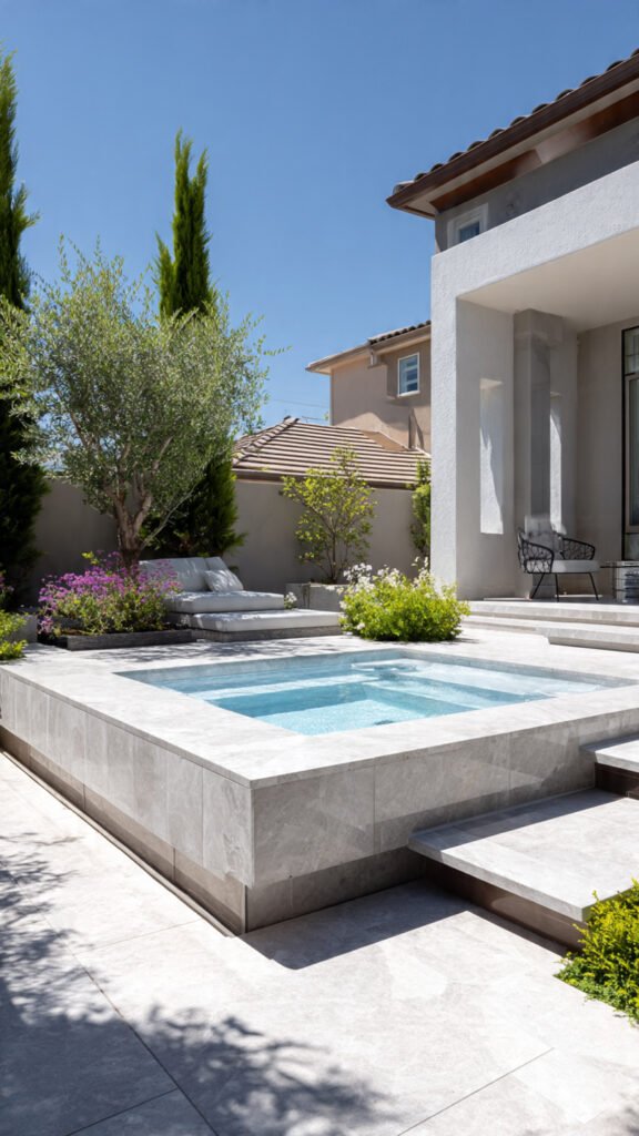 Stone surrounding a jacuzzi gives it a refined, hotel-inspired look. I love how stone feels solid and grounding. The backyard becomes calm and sophisticated. Nothing feels busy. Doesn’t simplicity often read as luxury? This design proves it.